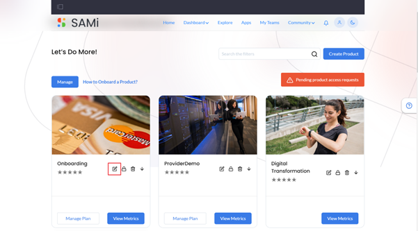 The SAMi update product feature helps the PO persona to edit, delete, or set permissions to an existing product in